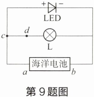 9. 海洋电池靠海水中的溶解氧与铝反应产生电能,利用化学能为航海灯供电。航海灯$L$、$LED$指示灯与海洋电池的连接如图所示,$LED$指示灯的正极应该靠近电源正极连接。