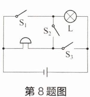 8. 如图所示,开关$S_{1}$、$S_{2}$、$S_{3}$均处于断开状态。若要小灯$L$和电铃串联,则应该只闭合开关