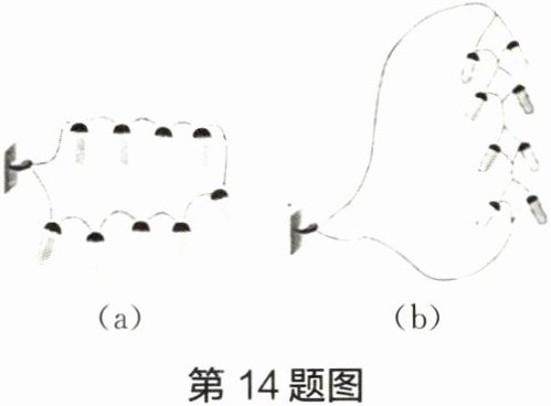 14. 如图(a)所示,装饰路旁小树的节日小彩灯可以烘托节日的气氛。但是小明发现这个电路有一个缺点,于是他和同学一起改进了节日彩灯,如图(b)所示。