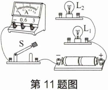 11. 在如图所示的电路中,有两根导线尚未连接,请用笔画线代替导线补上。已知电流表选用的量程是$0\sim 3\ A$。要求:开关$S$控制整个电路,电流表只测量通过灯$L_{1}$的电流。