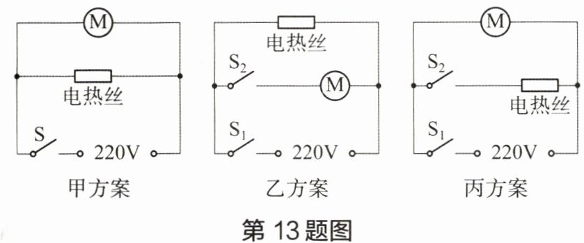 (2)丙方案。理由:丙方案可实现冷风(仅电动机工作)和热风(电动机与电热丝同时工作),且电热丝工作时电动机必工作,避免电热丝单独工作过热,符合安全用电原则及电吹风工作特点。