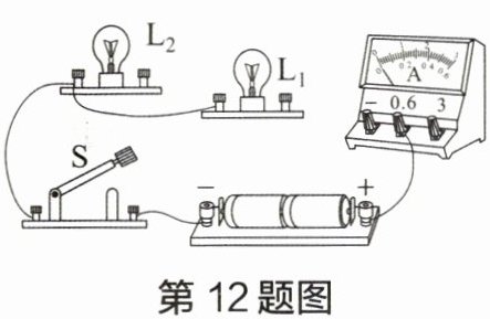 12. 在如图所示的电路中,有两根导线尚未连接,请用笔画线代替导线补上。要求:灯$L_{1}和L_{2}$并联,开关$S$同时控制两灯,电流表只测量通过$L_{2}$的电流。