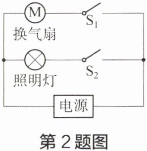 2. 小明家的卫生间里装有一台换气扇和一盏照明灯,它们的电路连接方式如图所示。则(