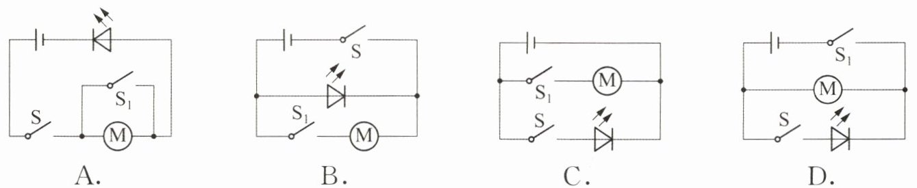 4. 一台扫地机器人,闭合其电源开关S,二极管指示灯( )亮;再闭合其清扫指令开关$S_{1}$,电动机M启动。S断开时,电路不工作。则下列电路中符合要求的是(