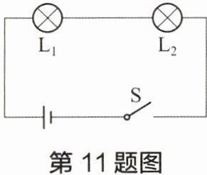 11 小明用两节干电池、两个不同规格的小灯泡和一个开关连接了一个电路,如图所示。闭合开关 $ \mathrm{S} $,发现小灯泡 $ \mathrm{L}_{1} $ 较亮,$ \mathrm{L}_{2} $ 较暗。根据此现象,小明认为通过 $ \mathrm{L}_{1} $ 的电流大,通过 $ \mathrm{L}_{2} $ 的电流小。请添加合适的实验器材,设计实验证明他的观点是错误的。