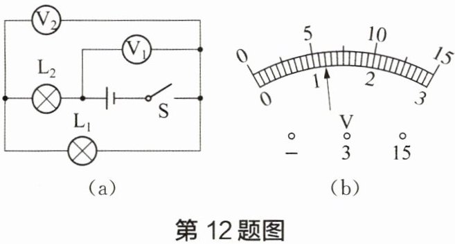 12 在如图(a)所示电路中,电压表 $ \mathrm{V}_{1} $、$ \mathrm{V}_{2} $ 是两只完全相同的电压表。闭合开关 $ \mathrm{S} $ 后,小灯 $ \mathrm{L}_{1} $ 和 $ \mathrm{L}_{2} $ 都发光,两电压表的指针都指在如图(b)所示位置。求 $ \mathrm{L}_{1} $、$ \mathrm{L}_{2} $ 两端的电压 $ U_{1} $、$ U_{2} $。