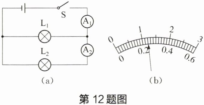 12. 在如图(a)所示的电路中,开关$S$闭合后,电流表$A_{1}$、$A_{2}$的指针都指在如图(b)所示位置。求通过小灯$L_{1}$、$L_{2}的电流I_{1}$、$I_{2}$。