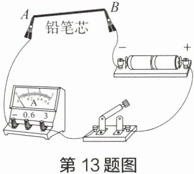 13 铅笔芯是由石墨和黏土混合制成的。不同型号铅笔的笔芯软硬程度不同,常用型号中6H的铅笔芯最硬,6B的铅笔芯最软,HB的铅笔芯软硬居中。铅笔芯是导体,为探究铅笔芯的电阻与其软硬程度的关系,小明同学用如图所示装置,先后将6B、HB和6H的铅笔芯接入电路A、B两点之间。
