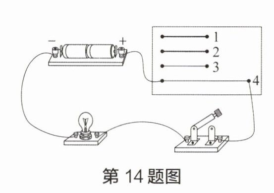 14 某小组同学在“探究电阻与导体长度、横截面积的关系”实验中,利用如图所示装置及四根电阻丝进行实验,电阻丝规格如下表所示。