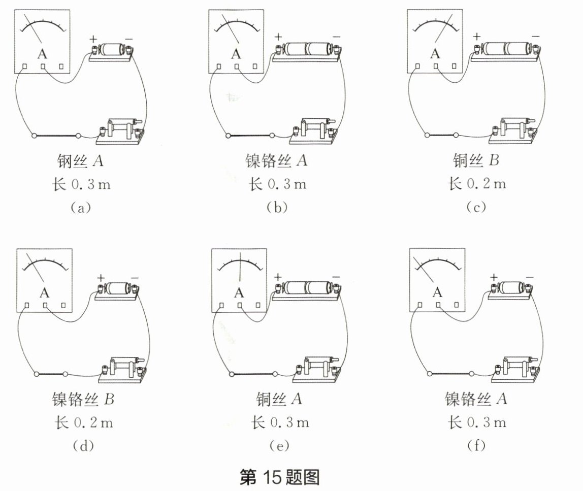 15 小明同学探究导体对电流的阻碍作用,所用器材为横截面积相同的导体、电流表、开关、新干电池和导线若干,实验过程如图所示。