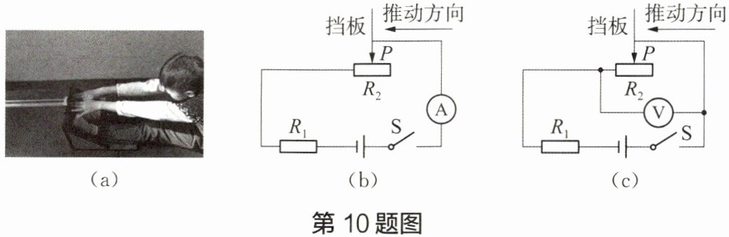10. 某项目化学习小组参加体质测试后,拟制作一个如图(a)所示的简易坐位体前屈测试装置。为将挡板推动至不同位置时所显示的成绩高低转换为电表示数显示,且成绩越高,示数越大,甲、乙两同学分别设计了如图(b)、图(c)所示的电路工作原理图。电路元件有:定值电阻$R_1$、滑动变阻器$R_2$、挡板(与滑片$P$相连)、显示成绩的仪表($A$实质是电流表,$V$实质是电压表)、开关、电源(电压保持不变)、导线。