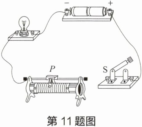 11. 在如图所示电路中,有一根导线尚未连接,请以笔画线代替导线补上。要求:闭合开关$S$,向右移动滑片$P$时,小灯变亮。