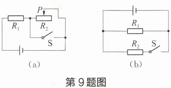 (1)在如图(a)所示电路中,当开关 $ S $ 断开时,若将滑片 $ P $ 向右移动,则总电阻将