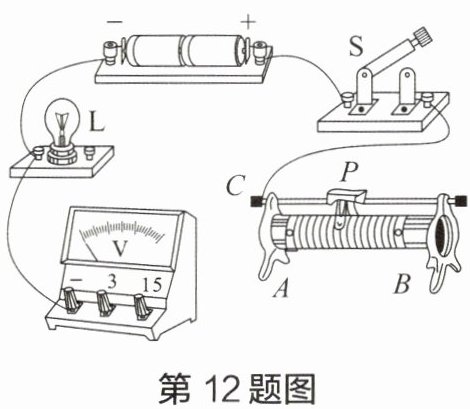 12 在如图所示的电路中,有两根导线尚未连接,请用笔画线代替导线补上。补上后要求:电压表测小灯两端电压;闭合开关 $ S $,向右端移动滑动变阻器的滑片 $ P $,小灯变亮。