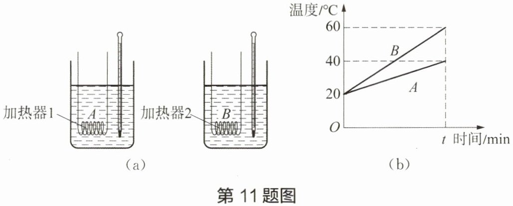 11. 小明用如图(a)所示器材探究不同物质吸收热量与物质种类的关系。用两个相同的加热器,通过控制加热时间相同,来保证$A$、$B$两种物质