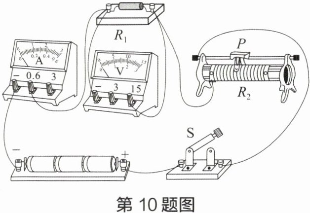 10 小明在“探究电流与电压的关系”实验中,连接电路如图所示。由于元件出现故障,闭合开关后,移动滑动变阻器滑片 $ P $ 的过程中,电压表的示数始终不变且不为零。已知电路中仅有一处故障,且只发生在电阻 $ R_1 $ 或滑动变阻器 $ R_2 $ 上。请写出移动滑片 $ P $ 的过程中,电流表可能的示数及相应的故障: