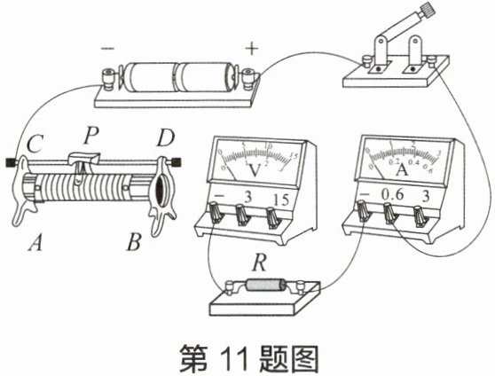 11 在如图所示电路中有两根导线尚未连接,请以笔画线代替导线补上。要求:该电路可以探究电流与电压的关系;闭合开关,向右移动滑片 $ P $ 时,电压表示数变小。