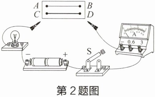 2. 连接如图所示的电路,分别将不同阻值的合金丝 $ AB $ 和 $ CD $ 接入电路,可观察到电流表示数及灯的亮暗都发生改变。由此现象可以提出的猜想是(