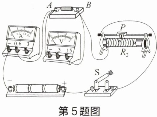 5. 小明为探究电流与电阻的关系,在如图所示情况下,将 $ A $、$ B $ 两点间 $ 10 \Omega $ 的电阻更换为 $ 20 \Omega $ 的电阻,闭合开关后,下一步操作应当是(