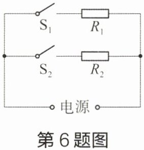 6 某电火锅有低温、中温和高温三挡,其简化电路如图所示,$ R_1 $、$ R_2 $ 为阻值一定的电热丝($ R_1 < R_2 $)。通过开关 $ S_1 $、$ S_2 $ 的断开和闭合,可以让电火锅在不同的挡位工作。已知该电火锅的干路电流越大,温度越高。下列说法中正确的是(