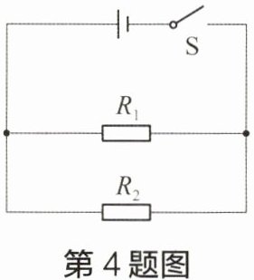 4 两个定值电阻的阻值之比 $ R_1 : R_2 = 2 : 3 $,将它们接入如图所示电路中,则通过它们的电流 $ I_1 $、$ I_2 $ 之比和它们两端的电压 $ U_1 $、$ U_2 $ 之比分别为(