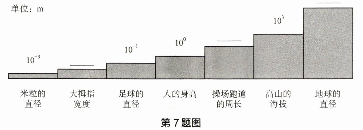 7 试在如图所示的长度阶梯图中的横线上填入合适的数量级。
