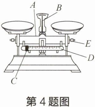 4 如图所示为托盘天平的结构示意图。图中 $A$ 是横梁,它能够在支架上自由摆动;$B$ 是