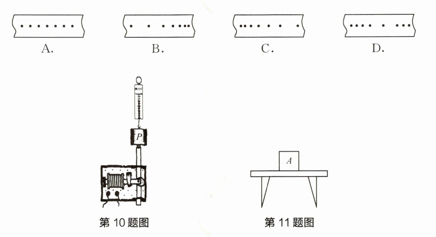 10. 如图所示,重力为$3N$的物体$P$挂在弹簧测力计下,其下端的纸带穿过打点计时器。现拉动物体$P$竖直向上运动,弹簧测力计的示数始终为$3N$。下列各纸带中能正确反映物体$P$的运动情况的是(