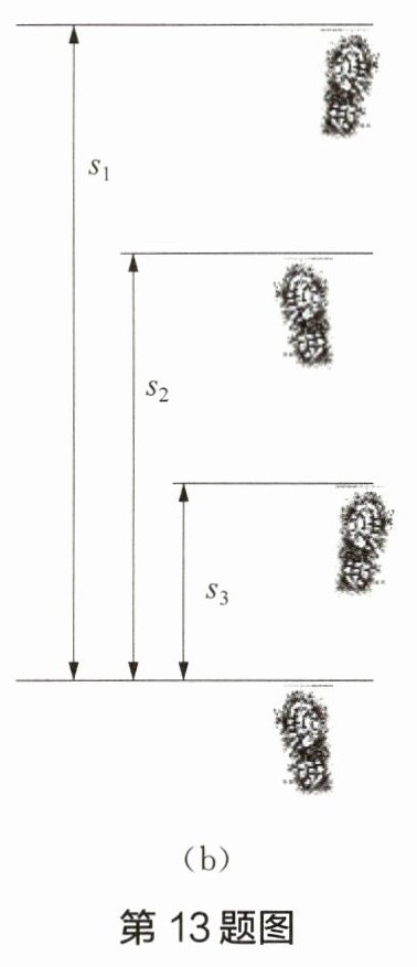 (选填字母代号)。(2)如图(b)所示为小明在沙坑中行走留下的左、右脚印。他分别测得$s_{1}$、$s_{2}$、$s_{3}$的长度。根据他所查资料,“一跬”的长度应为