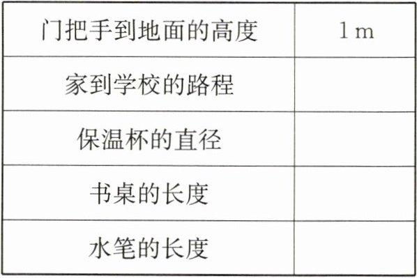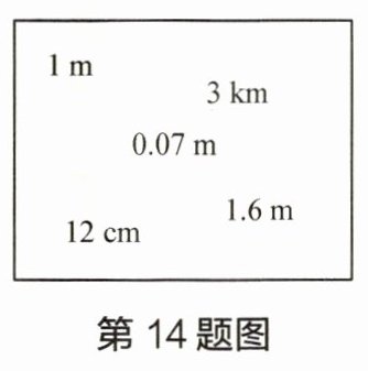 14 小明分别测量了多个长度,并将这些数据随意记在如图所示的草稿纸上,请你帮他分辨、整理各个测量数据,并重新记录在下表中。