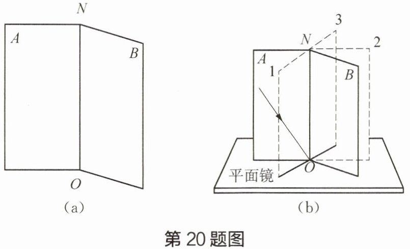 20. 在“探究光的反射定律”实验中,要确定反射光线和入射光线的位置关系。实验器材有:可旋转的光屏[如图(a)所示,光屏的 $ A $、$ B $ 两部分均可绕轴 $ ON $ 旋转]、平面镜和激光笔。将光屏竖直放在水平放置的平面镜镜面上,让激光笔发出的光沿光屏 $ A $ 入射到 $ O $ 点,如图(b)所示。