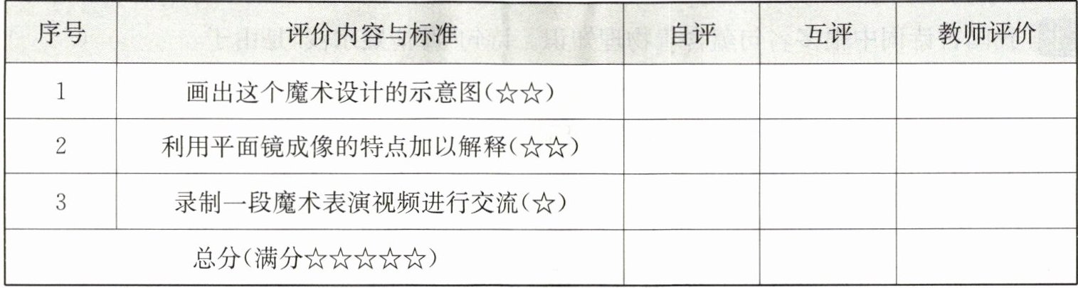 说明:严格依据平面镜成像规律(虚像、等大、等距)设计,符合八年级物理知识要求,操作可行。