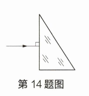 14 如图所示,一束入射光线从空气垂直射入横截面为三角形的玻璃砖。请在图中画出光线从空气进入玻璃、再由玻璃进入空气的光路图。
