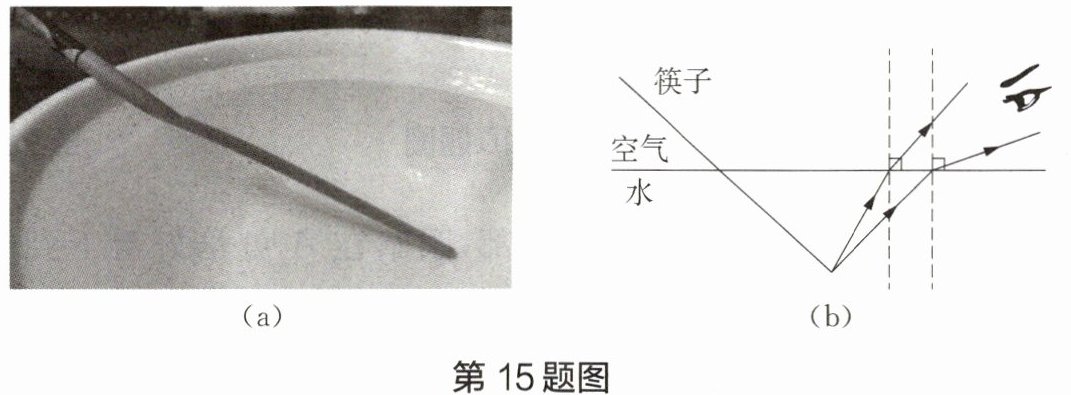 15 如图(a)所示,我们观察斜插在水中的筷子时,会发现筷子在水面处发生了弯折。请你在图(b)所示光的折射示意图中,画出看到的水中筷子大致的像,并说明看到的是虚像还是实像。