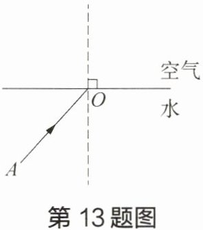 13 如图所示是光线在空气和水界面上发生折射的部分光路图,请在图中画出光线 $AO$ 的折射光线 $OB$ 的大致位置。