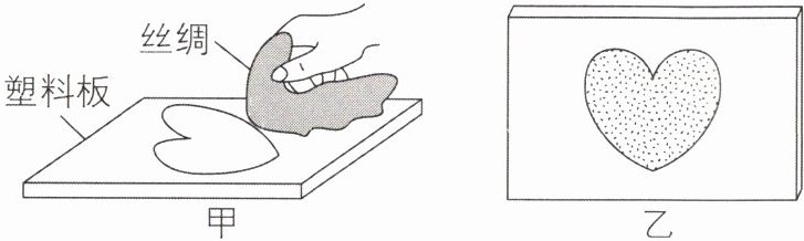 1 新考法[2025山西太原调研]母亲节,小伟自制了一个“爱心”送给妈妈。他先在塑料板上画了一个心形图案,用丝绸在心形轮廓内反复摩擦(如图甲所示),再在塑料板上均匀撒上红色纸屑,然后竖起塑料板,部分纸屑掉落后,塑料板上就出现了一个红色的爱心(如图乙所示)。关于“爱心”,下列说法正确的是 (