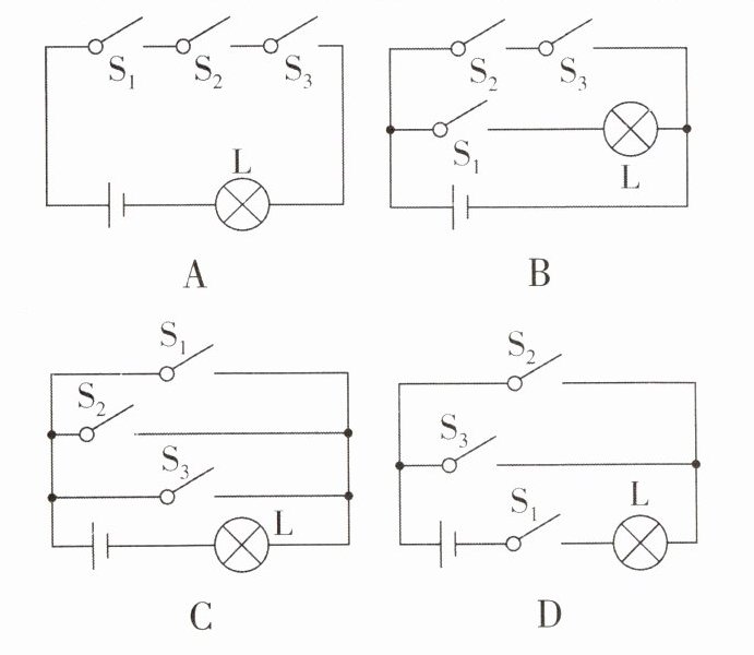 3 新素材 [2025 四川成都质检,中]某新款智能手机解锁点亮手机屏幕可简化为由三个开关控制的电路,三个开关分别是$ S_1($密码解锁)、$S_2($指纹解锁)、$S_3($人脸解锁),小灯泡 L 代替手机屏幕,三种解锁方式任意一种都能解锁点亮手机屏幕,下列电路图中符合要求的是(