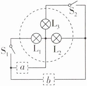 6 核心素养 科学思维 [偏难]如图所示是一种灯的结构示意图(虚线圆圈),内有三只规格相同的灯泡,分别为$ L_1、$$L_2、$$L_3,$且在“a”和“b”处应该分别接入合适的电源或开关$ S_3,$下列分析正确的是( )
