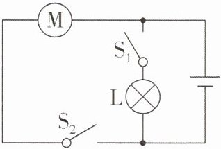 B 【解析】S₁与小灯泡串联,S₁只控制小灯泡→A错误;S₁、S₂都闭合时,电动机与小灯泡并联,两者互不影响→B正确,C错误;并联时某一支路被短路,则整个电路短路,小灯泡不能工作→D错误。故选B。