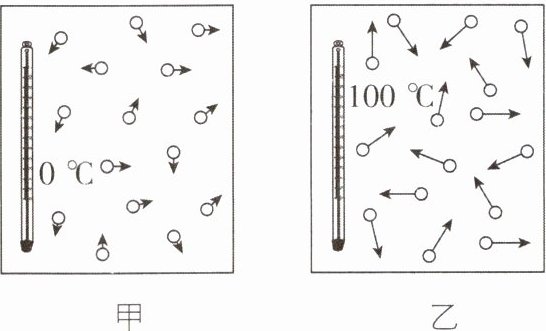 ①分子具有质量且分子在永不停息地做无规则运动(合理即可) ②乙 温度 【解析】①物体动能的影响因素是质量和速度,组成物体的分子具有质量且分子在永不停息地做无规则运动,因此分子具有分子动能。②由图可知,乙图中分子运动更剧烈;如果要反映某一物体中所有分子运动的情况是否剧烈,可以用宏观世界中的物理量温度来反映,同一物体,温度越高,分子运动越剧烈。