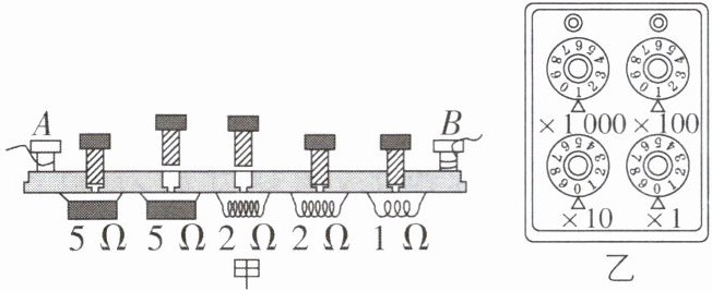 7 1 100 【解析】插入式电阻箱的原理是利用铜塞插入或拔出时连入电路中电阻丝的阻值不同来改变接入电路中的电阻。把铜塞拔出时,原铜塞下方的电阻丝就接入电路中,铜塞插入时,铜塞下方的电阻丝因被短路而不会接入电路中,根据上述原理,图甲中 A、B 两接线柱间的电阻值为 $ R_{AB}=5\ \Omega + 2\ \Omega = 7\ \Omega $。旋盘式电阻箱的读数方法是:分别读出每个表盘上旋钮下方指针对应的数字,并用该数字乘底下的倍数,最后将四个数据相加即可,故由此可读出图乙中旋盘式电阻箱的示数为 $ R=1× 1000\ \Omega + 1× 100\ \Omega + 0× 10\ \Omega + 0× 1\ \Omega = 1100\ \Omega $。