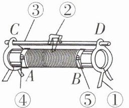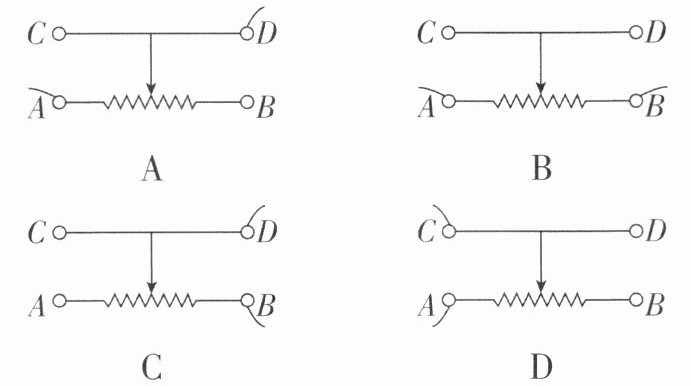 D 【解析】由图可知,③是金属杆,是用电阻较小的金属制成的,滑片与金属杆之间是接通的,所以接线柱 C、D 都能通过滑片②与电阻丝相连接,故 A、B 正确,不符合题意;滑动变阻器应按照“一上一下”的原则接入电路中,故 C 正确,不符合题意;要使滑片②右移时变阻器接入电路的阻值变大,可以连接 A、C 接线柱或 A、D 接线柱,故 D 错误,符合题意。故选 D。