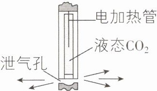 3 [2024 山西中考,中]二氧化碳$(CO_2)$爆破技术是现代工程建设中非常环保的技术,起爆前高压泵将$ CO_2$压缩成高压气体,液化后输入爆破筒内。如图所示,爆破时电加热管发热,使筒内的液态$ CO_2$迅速汽化,形成的高压气体从泄气孔中喷出,实施爆破。下列说法正确的是 (