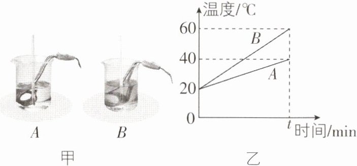 2 [2024 河北唐山期末,中]小强用如图甲所示器材探究不同物质的吸热能力与物质种类的关系,通过控制加热时间相同,来保证A、B两种物质