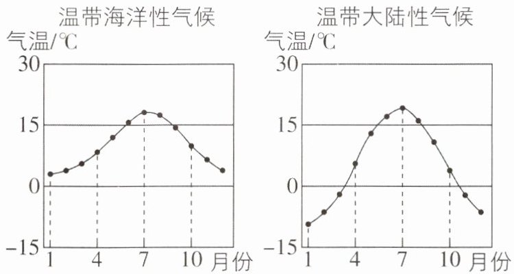 4 新考向 跨学科实践 [2025 湖南岳阳调研]同学们从地理学中了解到温带海洋性气候与温带大陆性气候有较大差异,气温上的差异尤为明显,从图中可发现1月与7月的月平均温度的温差较大的是
