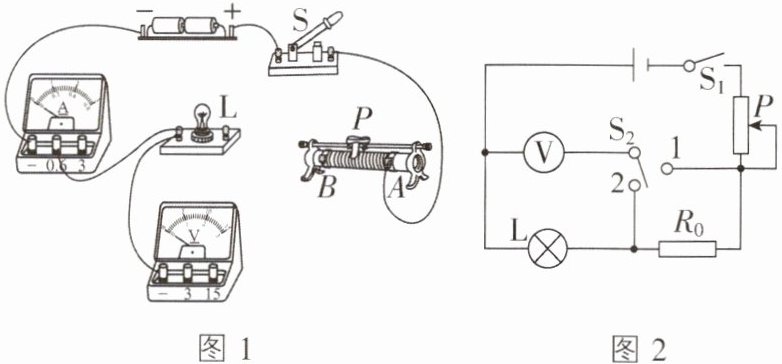(7)完成实验后,小组又设计了如图2所示的电路图,测量该小灯泡L正常发光时的电阻,R₀为定值电阻,S_2为单刀双掷开关,实验步骤如下: