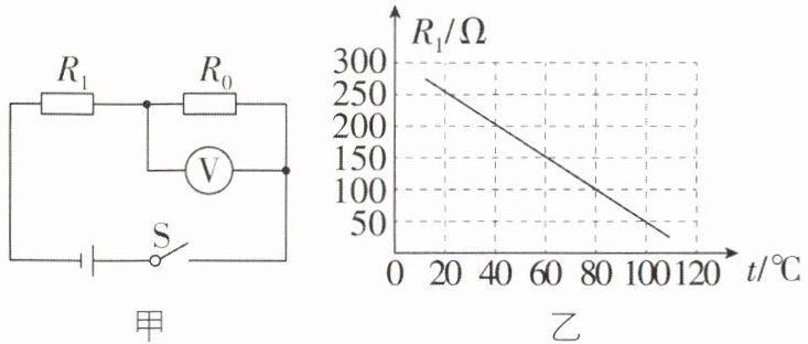 8[中]亮亮设计了一个用电压表的示数变化反映被测环境温度变化的电路,其电路原理图如图甲所示,电源电压不变,电压表的测量范围为0~3V,R₀是定值电阻$,R₀= 300Ω,R_1$是热敏电阻,其电阻随环境温度变化的关系如图乙所示。闭合开关S后,当环境温度为40℃时,电压表的示数为2.4V,求: