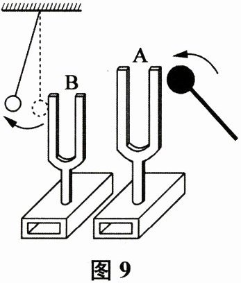 24. 如图9所示,用较大的力敲响音叉A,左边没有与之接触的音叉B也会发出较弱的声音,同时可以看到原来靠在音叉B上的轻质小球被弹开……