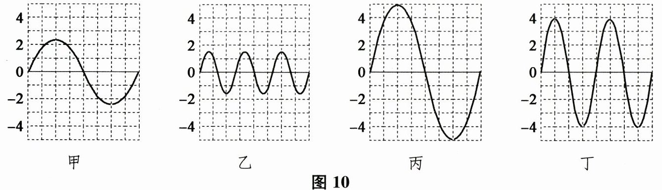 25. 某小组同学学习了声音的特征后,到实验室用四个不同音叉做了四次实验,并用同一示波设备记录了四次实验的波形图,如图10中甲、乙、丙、丁所示.