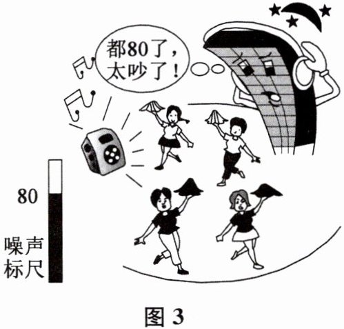 (1) 人们以分贝(dB)为单位来表示声音强度的等级,所以图中噪声标尺上显示的“80”,其单位是分贝(dB)。